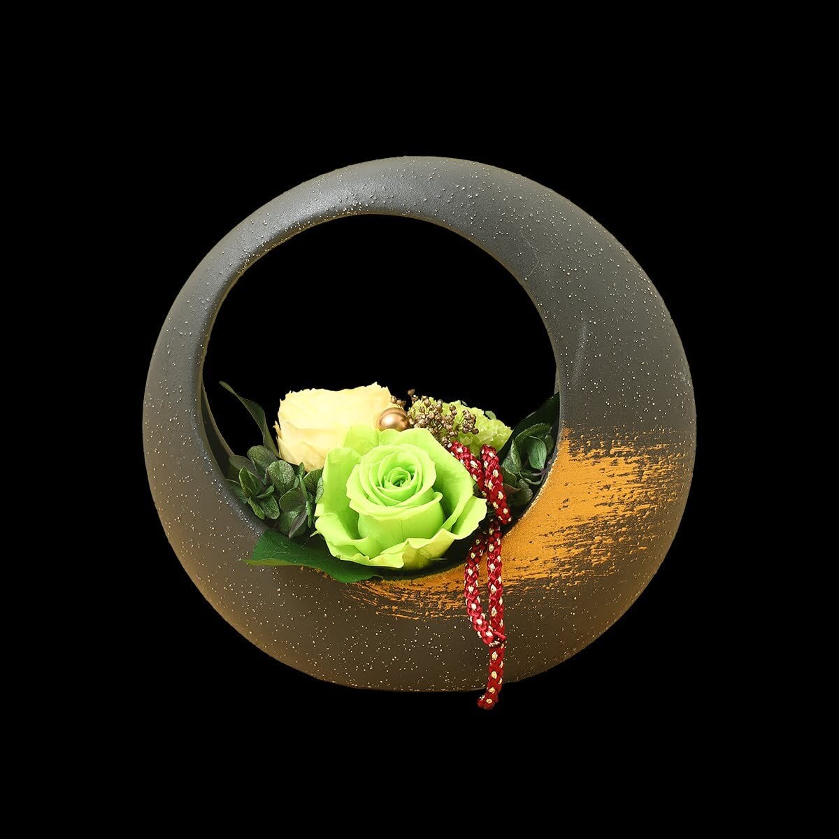 グリーンの薔薇、小菊、紫陽花が使用され、金打ち源氏紐のポイント使いがさらに高級感を演出しています。程よいサイズ感で、どんな場所でも存在感を放つことでしょう。