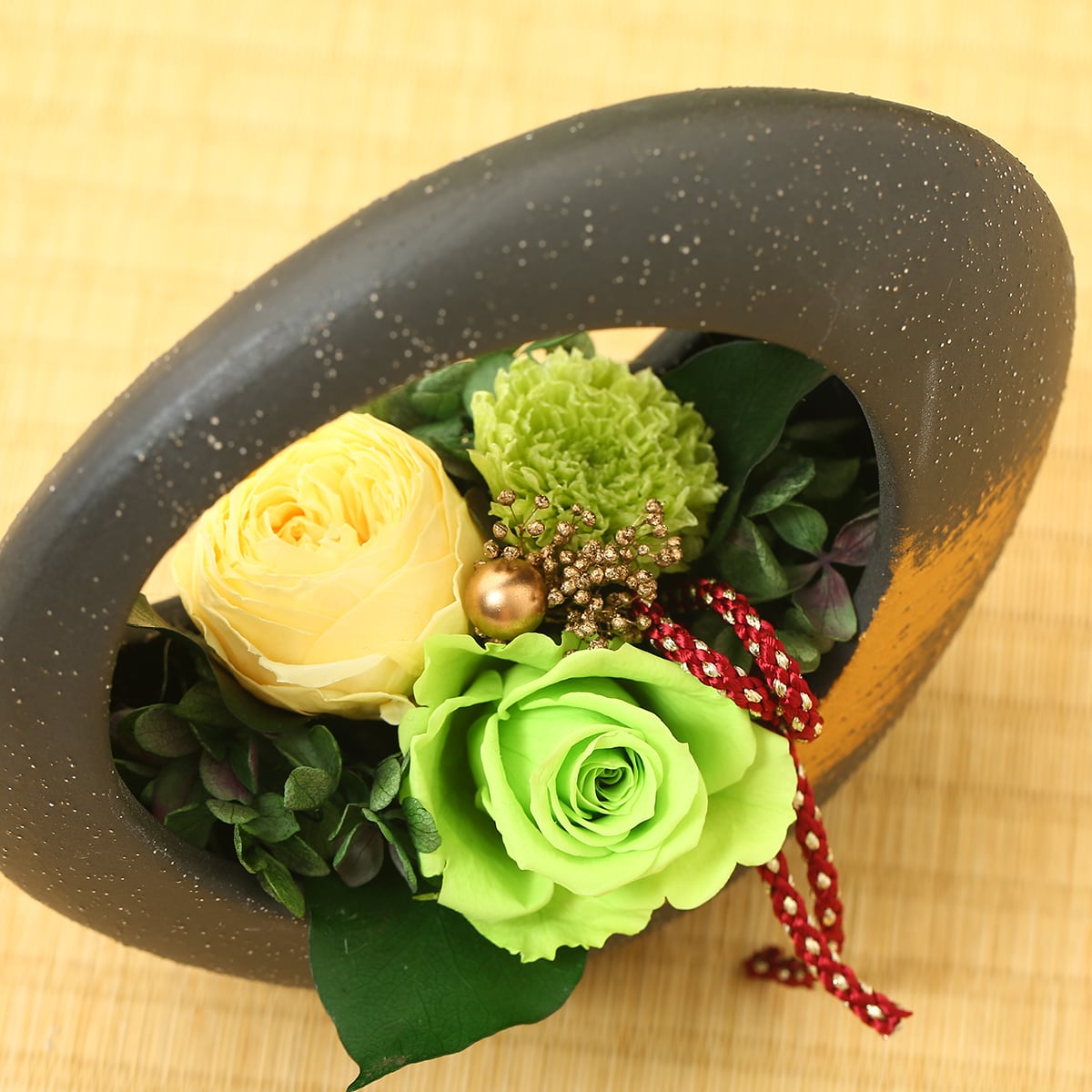 和風のプリザーブドフラワーアレンジメントは、華やかでありながらも上品な印象を与えます。