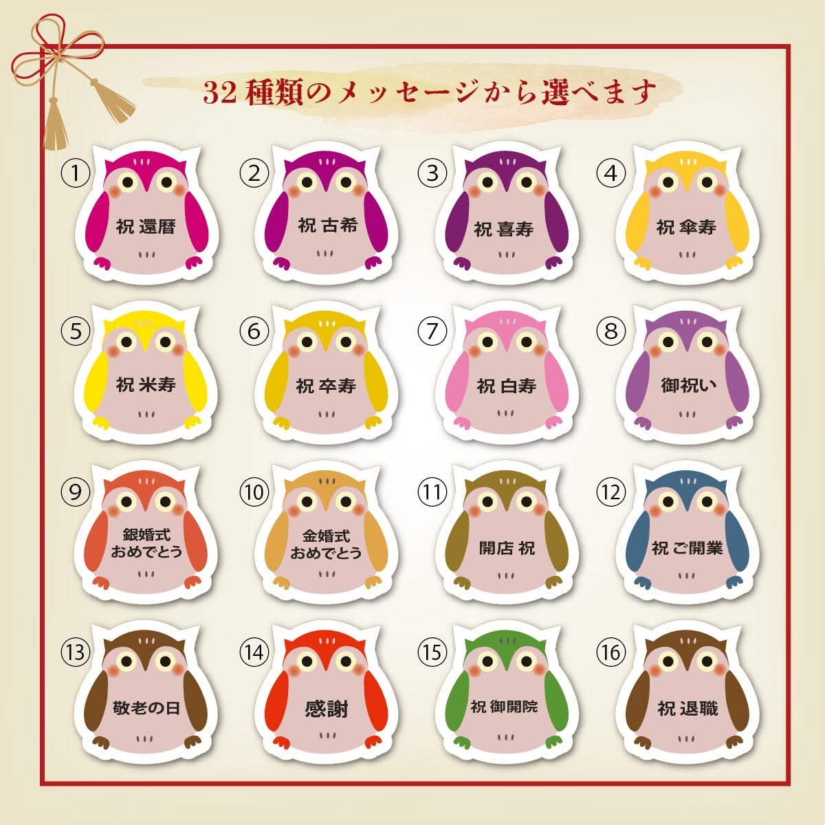 また、32種類の縁起の良いふくろうピックが選べます。ふくろうは幸運や知恵をもたらすシンボルとされており、贈り物としても最適です。